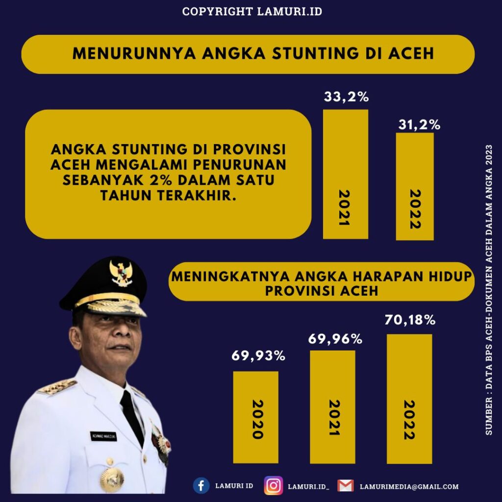 Untuk data angka Stunting di Aceh juga mengalami penurunan yang dimana pada tahun 2021 sebesar 33,2% dan pada tahun 2022 menurun sebesar 31,2% menandakan adanya penurunan angka stunting anak. Untuk Angka Harapan Hidup di Aceh mengalami peningkatan yang dimana pada tahun 2021 sebesar 69.96 dan pada tahun 2022 sebesar 70,18, menandakan adanya peningkatan Angka Harapan Hidup.