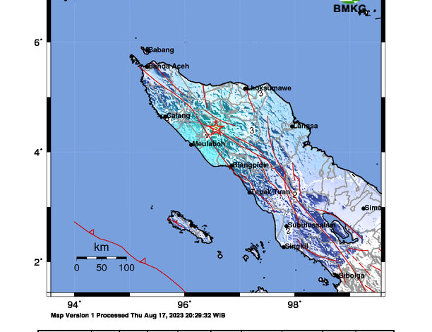 Banda Aceh – Gempa berkekuatan 5,2 M mengguncang Kabupaten Nagan Raya, Aceh, Kamis (17/8/2023) pukul 20.16 WIB atau bertepatan dengan HUT ke-78 Kemerdekaan RI.
