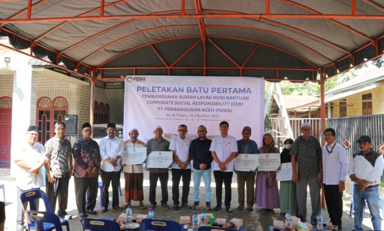 Aceh Utara – Direktur PT Pembangunan Aceh (PEMA) Perseroda, Ali Mulyagusdin menghadiri prosesi peletakan batu pertama pembangunan Rumah Layak Huni Bantuan CSR PT PEMA di Desa Ampeh, Kecamatan Tanah Luas, Kabupaten Aceh Utara pada Rabu (18/10/2023).