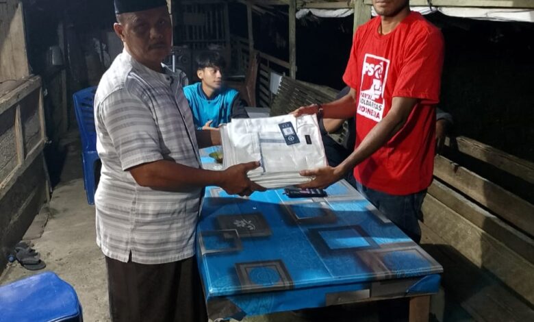 Nagan Raya – Relawan Partai Solidaritas Indonesia (PSI) menyerahkan seragam untuk grup ngaji Sabilil Jannah, di Desa Blang Panyang Seunagan Timur, Nagan Raya.