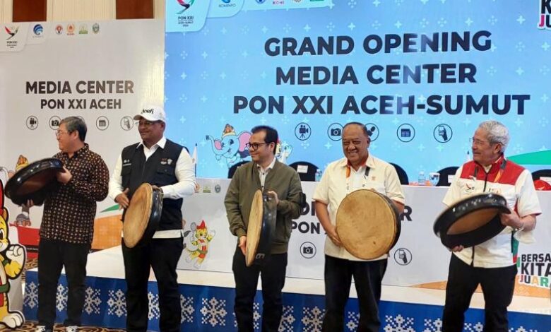 Pembukaan Media Center PON XXI Aceh-Sumut 2024 ditandai dengan pemukulan Rapa’i, alat musik pukul dari Aceh oleh Wamenkominfo Nezar Patria, Pj Gubernur Aceh Safrizal ZA dan Ketua Umum KONI Pusat Marciano Norman. []