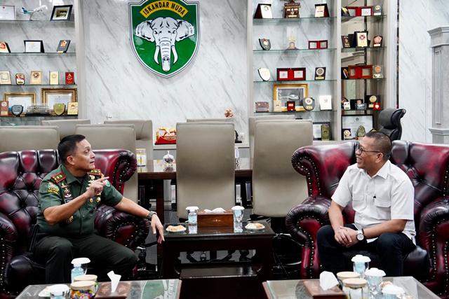 Banda Aceh – Panglima Komando Daerah Militer Iskandar Muda (Pangdam IM) Mayor Jenderal TNI Niko Fahrizal menerima audiensi dari Staf Khusus (Stafsus) Menteri Hukum dan Hak Asasi Manusia (Menkumham) Bidang Isu Strategis, Fajrimei A. Gofar, beserta rombongan di ruang kerjanya, pada Selasa (21/1/2025).