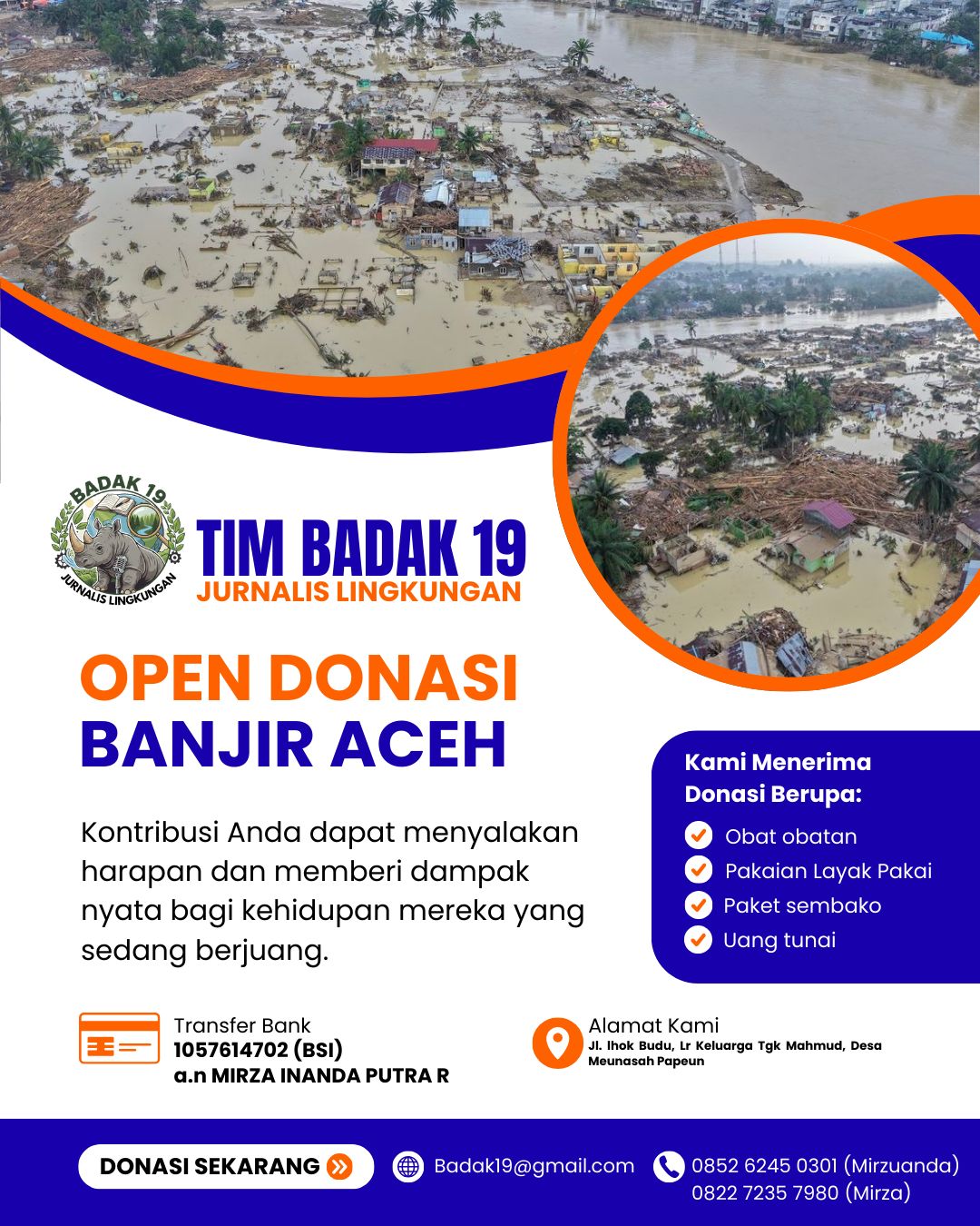 Banda Aceh – Tim Badak 19, komunitas jurnalis lingkungan, secara resmi membuka penggalangan donasi untuk membantu korban banjir yang melanda sejumlah wilayah di Provinsi Aceh dalam beberapa hari terakhir.