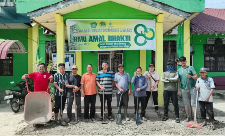 Langsa – Keluarga besar Madrasah Ibtidaiyah Negeri (MIN) 3 Kota Langsa melaksanakan kegiatan gotong royong pemulihan lingkungan madrasah pasca banjir hidrometeorologi yang melanda wilayah Kota Langsa beberapa waktu lalu.