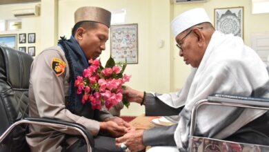 Bireuen – Kapolres Bireuen AKBP Jatmiko didampingi pejabat utama dan para perwira mengunjungi Tgk H Sofyan Mahdi (Abon Arongan) selaku…